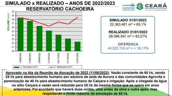 A Companhia de Gestão de Recursos Hídricos (Cogerh) se reuniu com os usuários do Açude Cachoeira nesta terça-feira (14), na Capela da Agrovila, no município de Aurora, para avaliar operação de alocação do 2º semestre de 2022 da barragem. Na última reunião de alocação, foi decidido uma vazão constante de 65L/s, sendo 25L/s para abastecimento humano por adutora da sede de Aurora e das comunidades da Agrovila e perenização de 40 L/s para abastecimento humano de Caiçara e irrigação. Com isso, foi simulado pela Cogerh que o açude iria chegar com 65,1% de sua capacidade ao fim de janeiro, contudo, o saldo final superou as expectativas, alcançando 83,27% (28,5 milhões de m³) de seu volume máximo. Atualmente, o açude está sangrando, ultrapassando seu volume máximo de 34,3 milhões de m³.