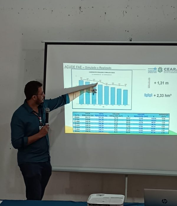 Cássio também apresentou o aporte dos açudes da bacia, destacando o Açude Faé que, no período de 01/01 a 23/02/23, teve um aporte de 0,4 milhão de m³. Atualmente, o reservatório está com volume de 10,45 milhões de m³, equivalente a 81,7% de sua capacidade total.