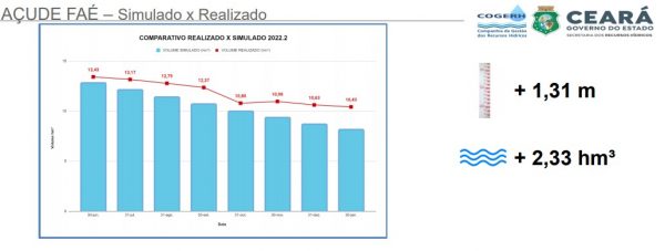 Durante a operação do 2º semestre de 2022 do açude, a vazão alocada foi 100 litros por segundo (l/s), porém, a vazão operada foi de 75 l/s. Ao final da operação, no dia 31 de janeiro, a