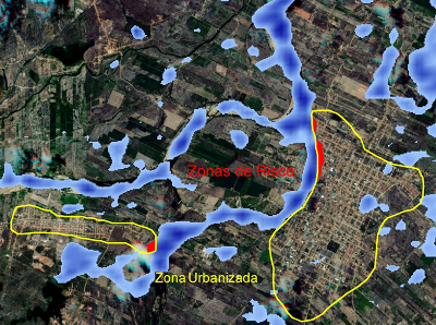 Nos meses de Janeiro a Junho o Núcleo Técnico Operacional – NTO reúne-se, periodicamente, para formular regras operacionais para a Comissão de Supervisão e Controle, instância na qual são adotadas as decisões operacionais. A atividade de avaliação da capacidade do rio foi inicializada pela COGERH com levantamento topo-batimétrico de 98 seções transversais da calha do rio Jaguaribe, o que permitiu uma intepolação de mais de 500 seções que foram utilizadas nas modelagens hidrodinâmicas. No levantamento das seções foram percorridos aproximadamente 240 km de rios, sendo o espaçamento médio das seções na ordem dos 3 km em áreas não habitadas e com menor intervalo em áreas de adensamento populacional e/ou críticas para a modelagem dos dados. Em seguida, de posse de plantas planialtimétricas dos municípios de Limoeiro do Norte, Russas e Jaguaruana procedeu-se a geração de um Modelo Digital de Terreno – MDT que contemplou toda área coberta pelo levantamento topobatimétricos e de cobertura das referidas plantas. Para possibilitar um modelo que contemplasse a área não levantada, foi utilizado o produto de sensoriamento remoto Shuttle Radar Topography Mission – SRTM/NASA, que resultou num Modelo Digital de Elevação – MDE. A COGERH adquiriu ainda, imagens orbitais do satélite RapidEye que contemplam a área do estudo. Essas imagens estão subsidiando: a identificação de áreas críticas ao PCVJ; o planejamento dos levantamentos topobatimétricos e o mapeamento das modelagens de manchas de inundação. Estes trabalhos são realizados em ambiente de Sistema de Informação Geográfica – SIG, por meio do software ArcGis com extensão 3D Analyst (ESRI) e GeoHecRas (HRC) e também em software de modelagem hidráulica Centers River Analysis System – HecRas produzido pelo Hydrologic Engineering Center – HEC do U.S. Army Corps of Engineers – USACE. Ainda em fase de confecção estão sendo determinadas as áreas de inundação das zonas urbanas, nesta fase é necessário o detalhamento da planta semi-altimetrica cadastral em cada cidade. A figura 5 mostra um esboço da delimitação de risco na cidade de Limoeiro do Norte.
