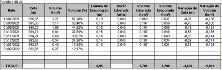 Em seguida, foi definida pelos presentes a vazão de 40l/s para a alocação do Açude Penedo, vazão máxima permitida pelo Comitê de Bacias Metropolitanas. A operação seguirá até fevereiro de 2022. Além disso, durante a reunião, a Cagece se comprometeu em proporcionar melhorias no sistema de distribuição de água, a fim de diminuir a retirada de água do Açude Penedo. Confira abaixo dados da simulação da operação, conforme a vazão definida: