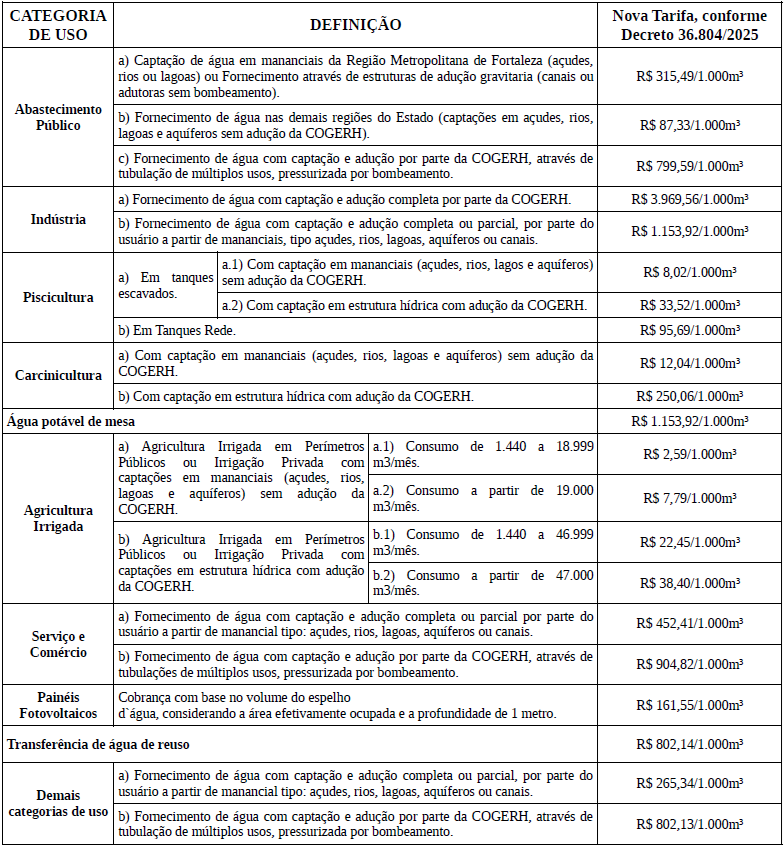 A COGERH é responsável pelo estudo tarifário, implementação e arrecadação. A regulamentação da tarifa dar-se-á por meio de resolução emitida pelo Conselho Estadual dos Recursos Hídricos – CONERH, e somente será efetivada após publicação de decreto de cobrança emitido pelo Governo do Estado do Ceará.
